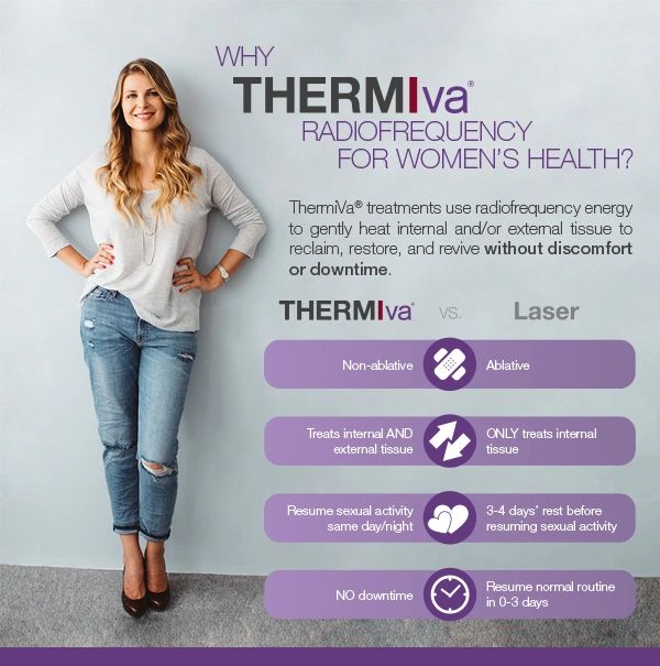 ThermiVA uses radiofrequency to shrink tissue without pain or downtime. Results are seen after as little as one treatment, in most cases 3 ThermiVA Treatments (one month apart) are recommended for best results. thermiva procedure vaginal walls